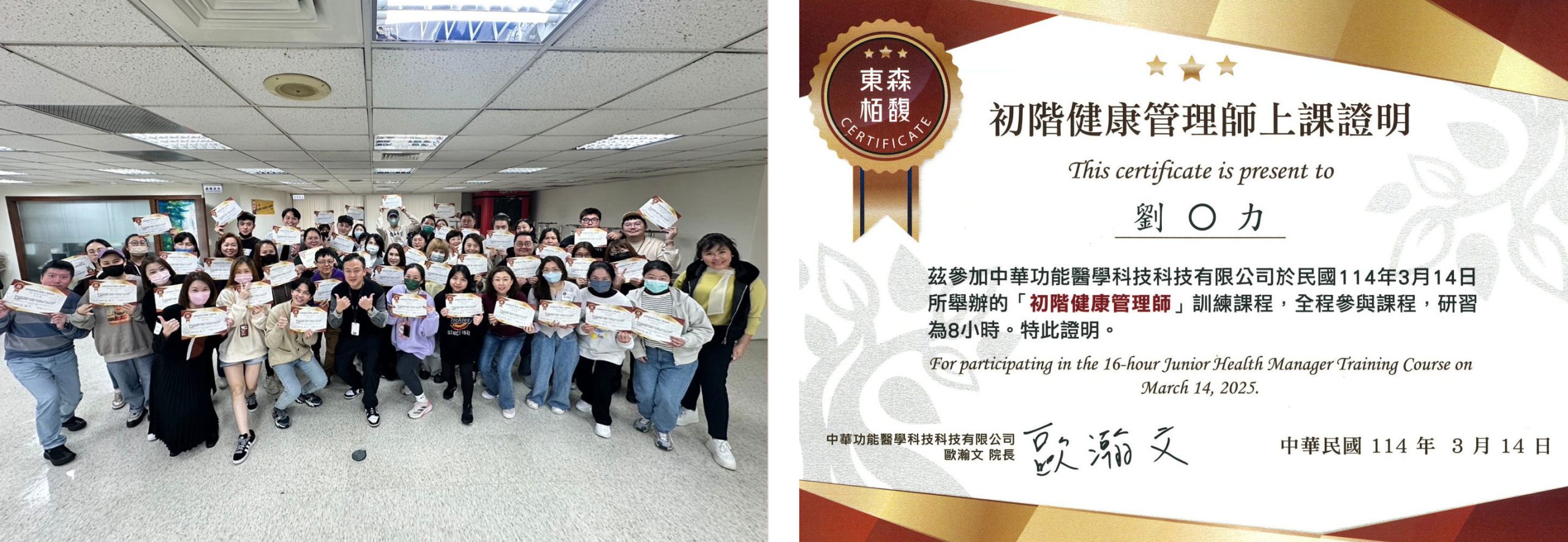 本頁特設「健康管理認證名單專區」,公開展示具證照同仁名單及頒發日期,展現東森在專業健康服務上的堅定承諾,並持續以科學化、專業化的健康管理,陪伴每一位顧客邁向更美好的生活。